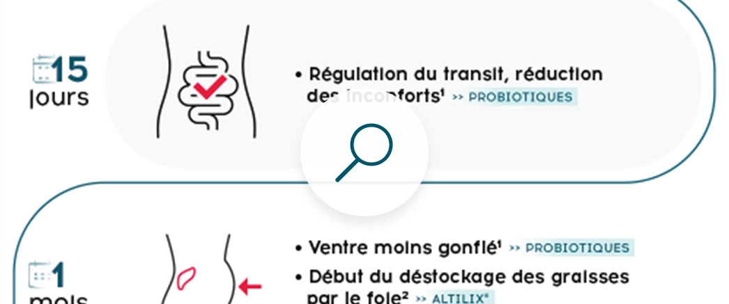 Une cure de 3 mois de LIPOCIBLE Expert est recommandée pour une efficacité optimale. Les recherches menées sur MOROSIL® et ALTILIX® confirment que les effets les plus marqués se manifestent à partir de 90 jours d’utilisation.